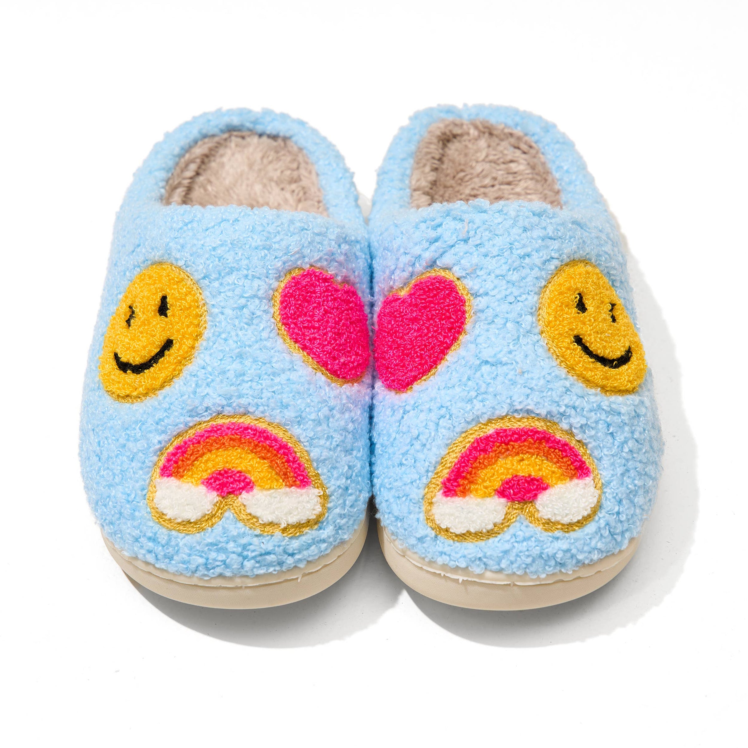 These adorable Blue Smiley Rainbow Slippers are embellished with Smiley faces, Hearts and Rainbows to keep staying warm and cozy so fun!
