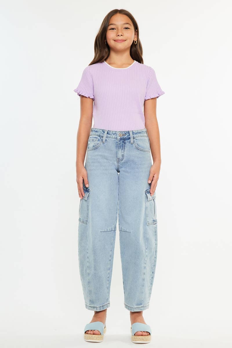 THE WAIST OVERSIZED FIT WITH A BARREL LEG & TAPERED BOTTOM RISE 8 5/8" INSEAM 24 1/2" WB 1 1/2" IN SIZE 10 99% COTTON, 1% SPANDEX 13.5 OZ