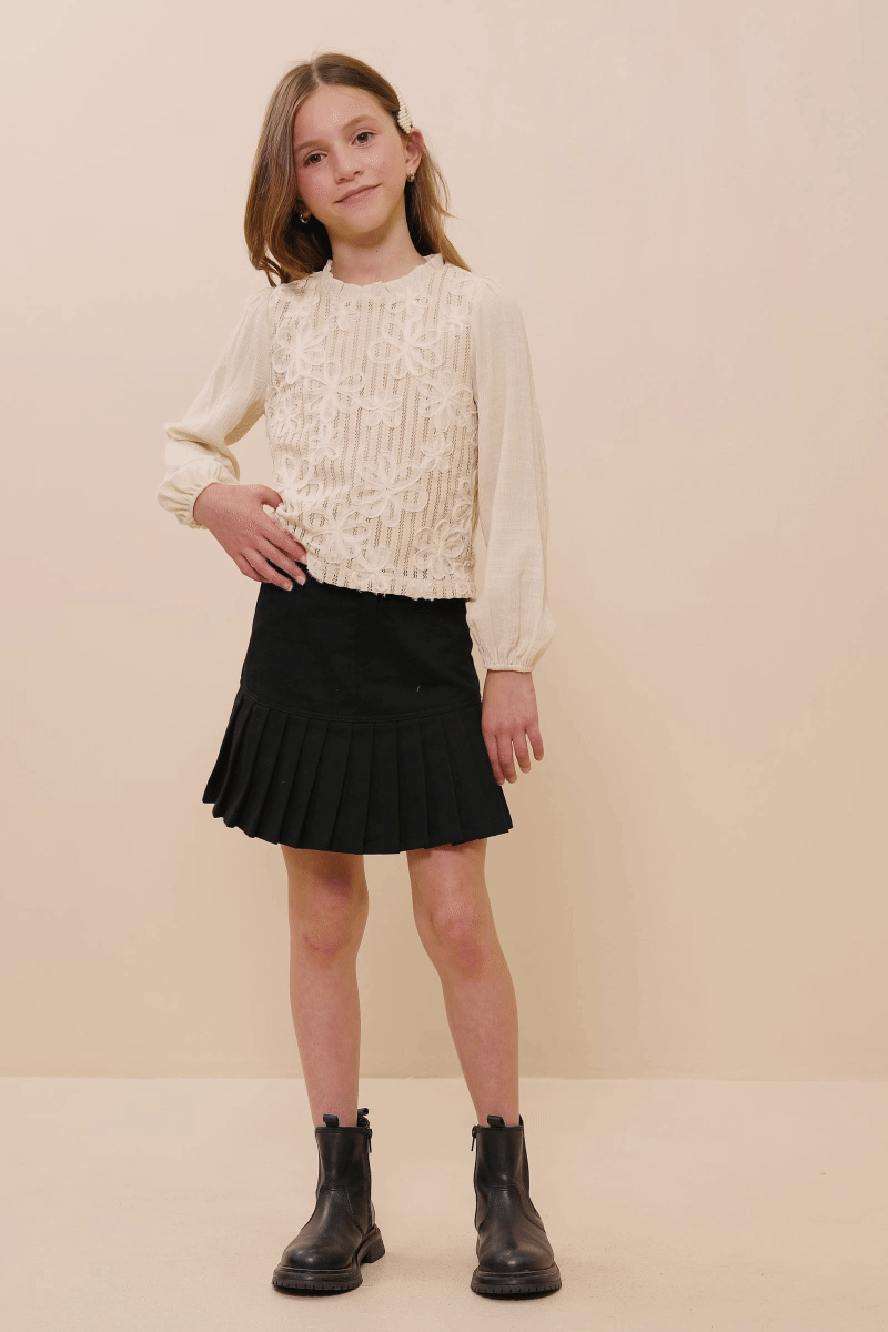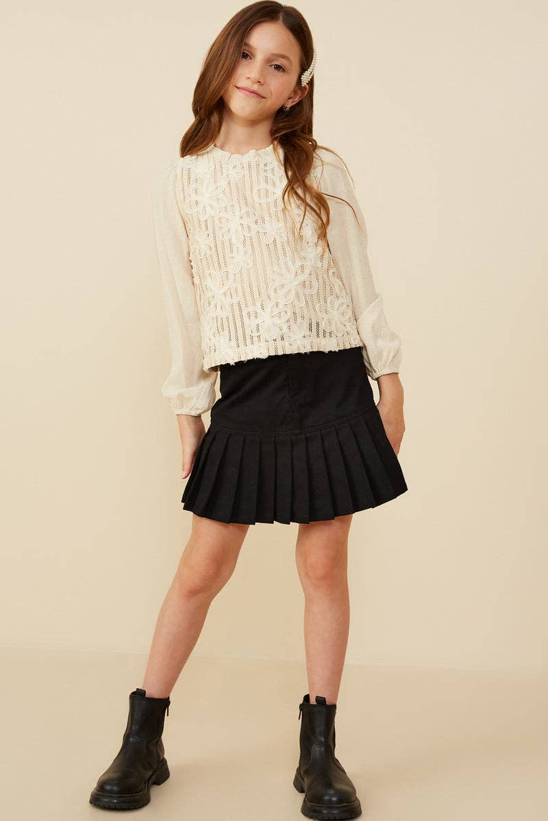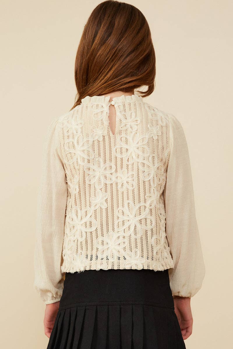Floral Embroidered Textured Puff Sleeve Top Features: * Textured Floral Fabric * Ruffle Neckline * Top Lining