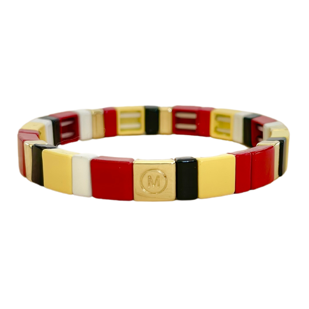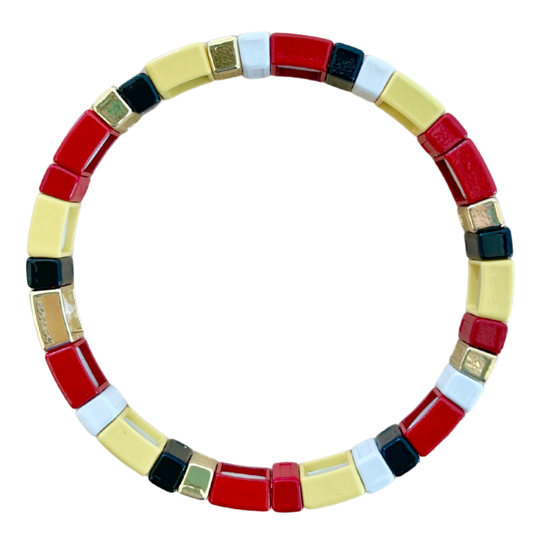 These multi colored tile bracelets are the epitome of arm candy! This bracelet features a brighter shade, whereas the tall version of the Chiefs tile bracelet has the original, more golden, shade. Enamel coated metal beads are both lead and nickel free. Strung together with heavy duty elastic bands, they are easy to get on and off. The bracelets are ~7 inches long with an inside diameter is 2 inches, which fit most women. Wear them individually or stack them together with other bracelets for an elevated arm party!
