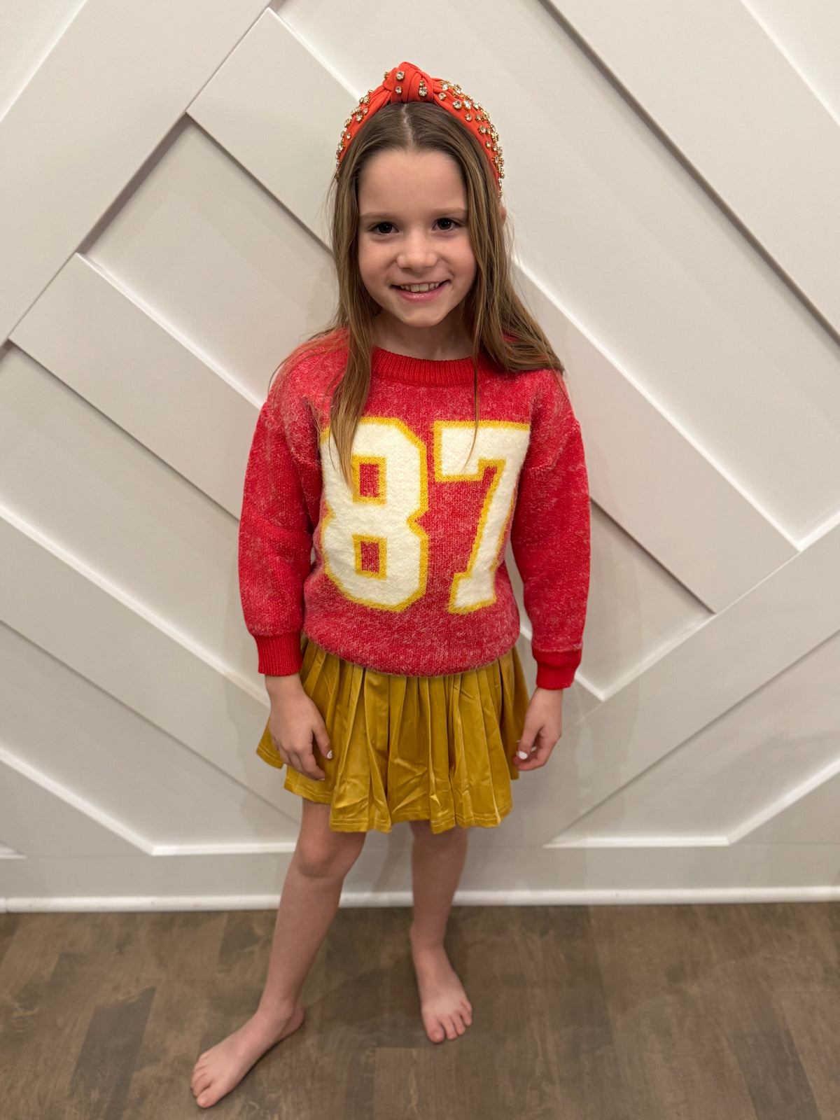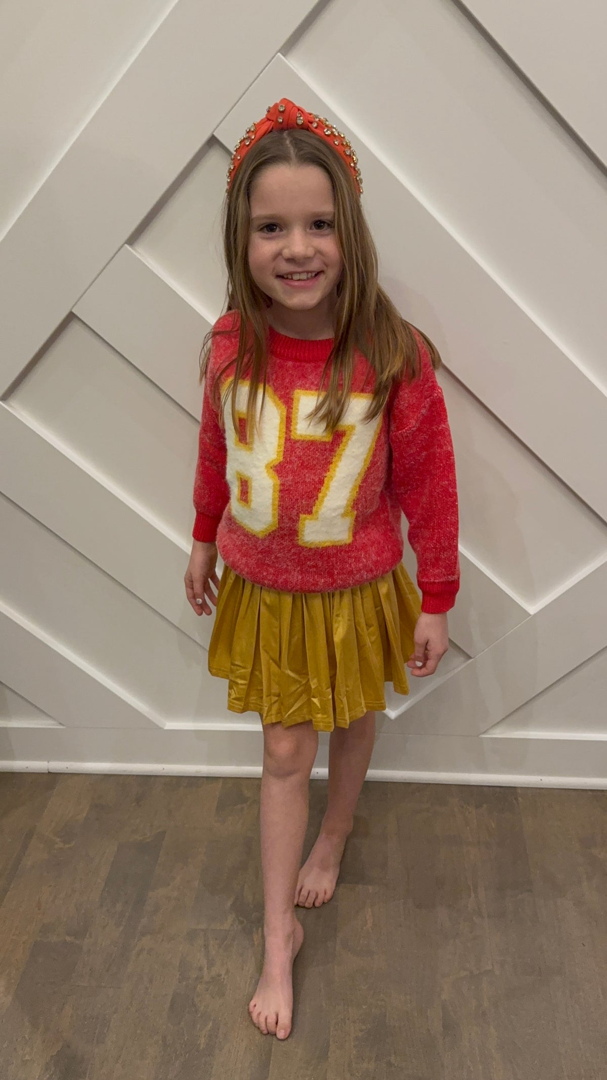 Warm & soft fuzzy red sweater with 87 on it to replicate a jersey. Here it's shown paired with our tan cheer costume which offers an athletic set & varisty jacket!
