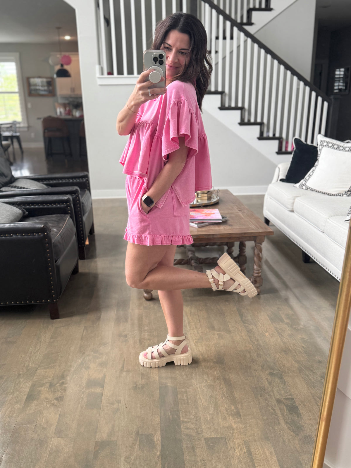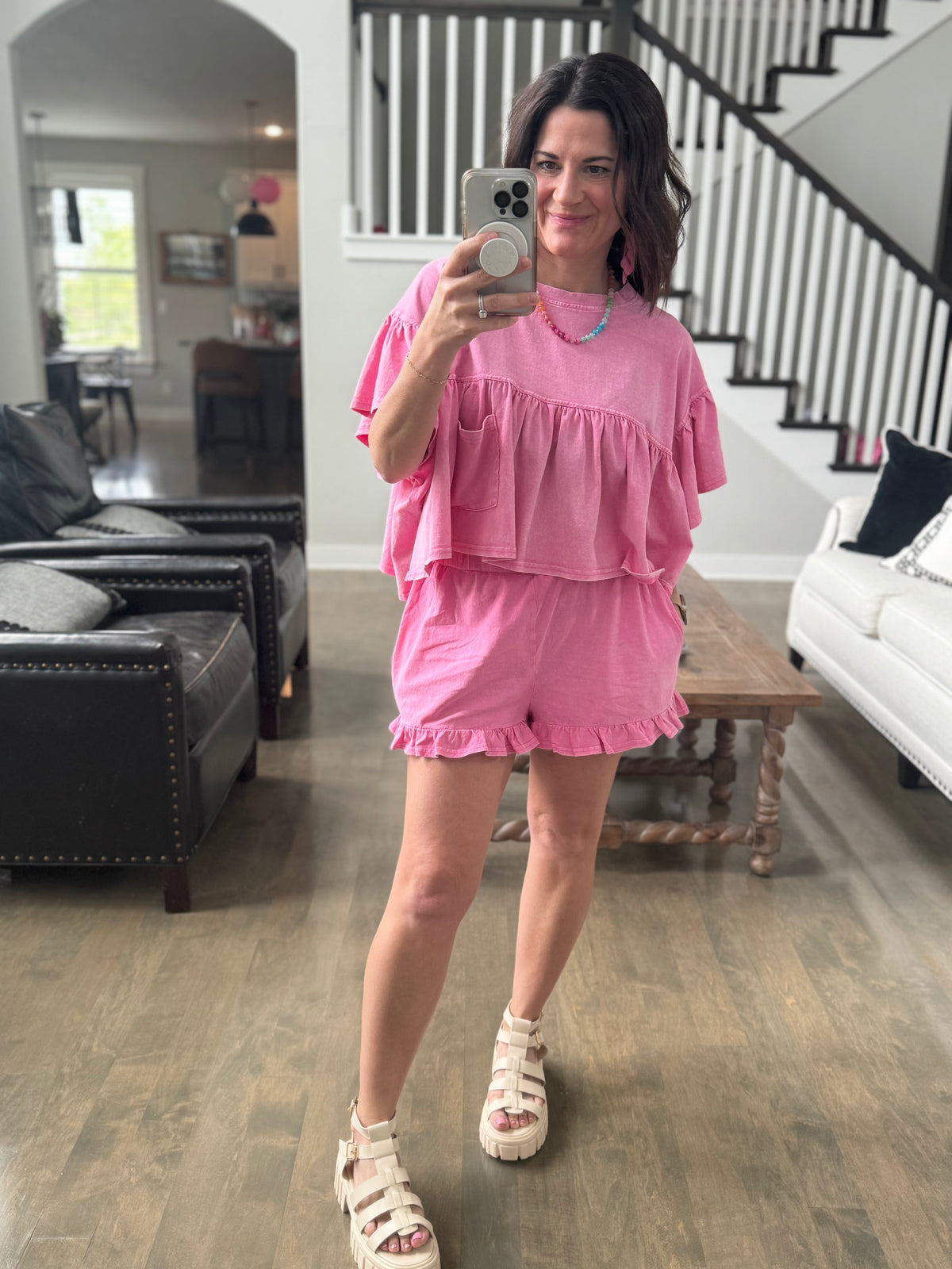 Ladies, this is comfy, cute, and can be worn together or separately. Pair the top with some jean shorts. Put a Cami with the shorts.